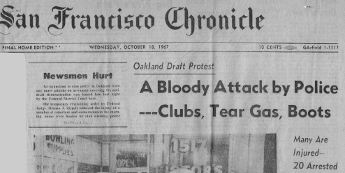 The cops of Tuesday were neither moving- nor police-men, but pain delivery devices. They had read the manifestos of Stop the Draft Week, PEOPLE GET READY, BY OUR DECREE THE OAKLAND INDUCTION CENTER WILL BE CLOSED, and took them seriously. The protestors of Tuesday, like those of Monday, claimed their right to block the door, but announced they would avoid arrest. This violated natural law. As objects, they intended to commit a crime, and as humans to escape the consequences. You can’t have it both ways, said the cops of Bloody Tuesday, detecting a practical fallacy: as objects you may block the streets, but as humans you will suffer pain. And while we’re at it, no such activity as defending yourself against the police exists for there is no such thing as defense against the law, which we are. Therefore on Tuesday morning the Oakland police charged from the parking structure on Clay like the Legions of the Garrison of Rome, beat, gassed, clubbed, Chemical Maced, and stomped everyone they got their hands on of the thousands who showed up. For this defense against blasphemy they were rewarded with an insulting and incomprehensible banner headline: