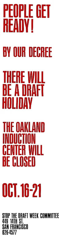Five days of this and for what? To shut down one building at 13th and Clay, a facility anonymous and disquieting as an unlabled can, built to hold a Center for Sorting Useless Items, or, if Alameda County had one, a Department of Forlorn Hopes and Vacant Time. Instead, it housed the U.S. Armed Forces Induction Center, chokepoint for every Northern California male eligible to be sent to Vietnam.