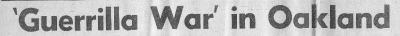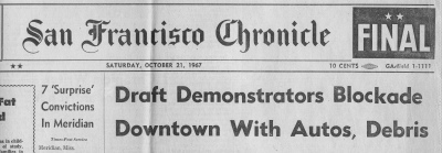 The cops of Tuesday were neither moving- nor police-men, but pain delivery devices. They had read the manifestos of Stop the Draft Week, PEOPLE GET READY, BY OUR DECREE THE OAKLAND INDUCTION CENTER WILL BE CLOSED, and took them seriously. The protestors of Tuesday, like those of Monday, claimed their right to block the door, but announced they would avoid arrest. This violated natural law. As objects, they intended to commit a crime, and as humans to escape the consequences. You can’t have it both ways, said the cops of Bloody Tuesday, detecting a practical fallacy: as objects you may block the streets, but as humans you will suffer pain. And while we’re at it, no such activity as defending yourself against the police exists for there is no such thing as defense against the law, which we are. Therefore on Tuesday morning the Oakland police charged from the parking structure on Clay like the Legions of the Garrison of Rome, beat, gassed, clubbed, Chemical Maced, and stomped everyone they got their hands on of the thousands who showed up. For this defense against blasphemy they were rewarded with an insulting and incomprehensible banner headline: