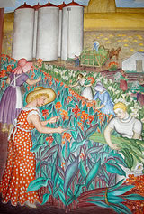 Aha. San Francisco known for its pinko art. Pinko seal in Sausalito. Pinko conquest of California in Rincon Annex, pinko St. Francis feeding birds somewhere. Jimmy slid through, faced serious maidens in sunbonnets gathering cala lilies by the armload before three silos like giant baby bottles in a field of yellow ochre, tiny horses, wheat like golden barns, farmworkers in polkadot dresses.