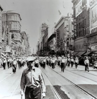 The camera looks up and down the street. It sees figures in the shadows. A POLICEMAN stands in the center of the Embarcadero. A man runs across an intersection two blocks away. There are no cars, buses, trucks. Three policemen on horseback trot down Market Street, turn to Walter’s right, move north.